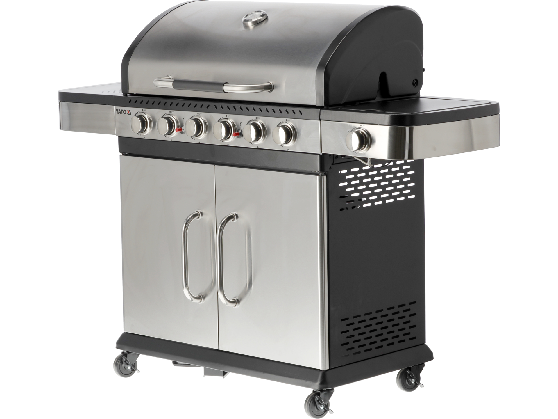 Grill gazowy 6+1 o nowoczesnym wyglądzie wykonany ze stali nierdzewnej, wyposażony w żeliwny ruszt. Półki boczne oraz pojemna, zamykana szafka ułatwią przechowywanie przypraw i niezbędnych akcesoriów. Palnik boczny o mocy 2,2 kW umożliwi gotowanie i podgrzewanie potraw w garnku lub na patelni