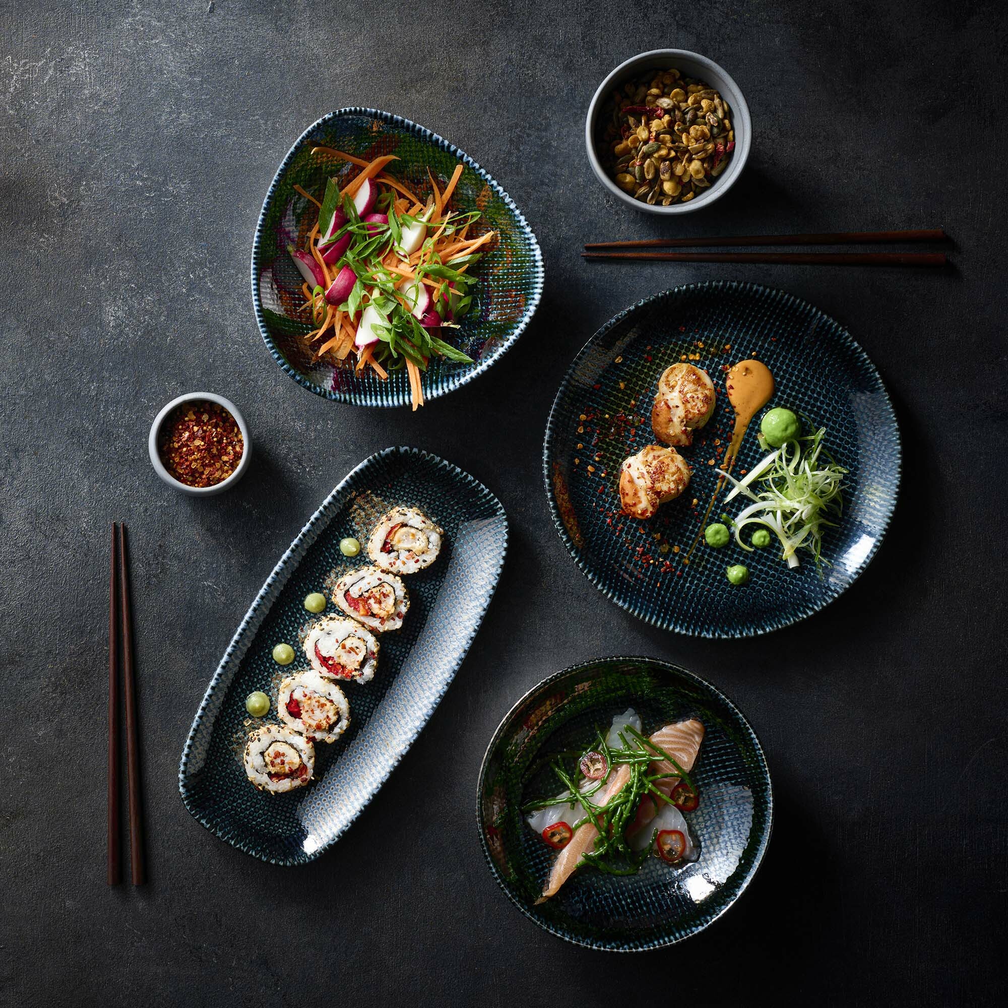 Wzór Astro czerpie inspirację z metalicznych, artystycznych glazur – ich blasku i połysku. Ten efekt uzyskano dzięki podglazurowemu procesowi druku Churchilla, który dodatkowo wzmacnia odporność. Kolekcja doskonale komponuje się z surowymi materiałami i ciemnymi barwami przemysłowych wnętrz, z odsłoniętymi rurami i cegłami, tworząc przestrzenne, miejskie aranżacje restauracyjne. Kolekcja spełnia wszystkie wymagania trwałości i parametrów technicznych niezbędnych w środowisku gastronomicznym.