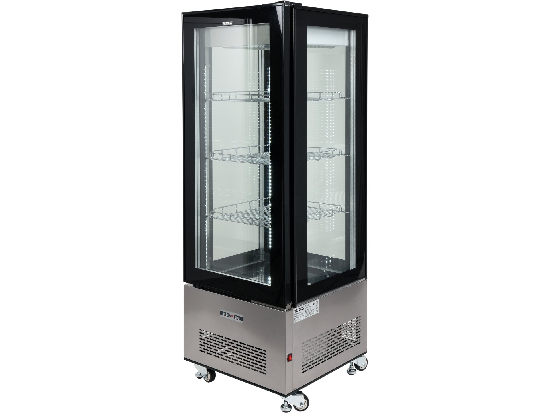 Witryna chłodnicza YATO wolnostojąca o pojemności 400L w kolorze czarnym o wymiarze 650x650x1908mm. Witryna chłodnicza marki YATO przeznaczona jest do ekspozycji ciast, tortów, koktajli, jogurtów czy różnego rodzaju napojów orzeźwiających, a także sałatek czy drobnych przekąsek. Nowoczesne wzornictwo połączone z wysoką jakością surowców powoduję, że witryna chłodnicza YATO doskonale prezentuje się na froncie we wszelkiego typu cukierniach, kawiarniach, restauracjach czy punktach handlowych. Dodatkowo zainstalowane oświetlenie LED z czterech stron eksponuje prezentowane potrawy w bardzo atrakcyjny sposób zachęcając klientów do ich wyboru. Witryna chłodnicza YATO ma pojemność 400L i posiada dwie wzmacniane i chromowane półki o regulowanej wysokości mocowania. Dostęp do nich odbywa się za pośrednictwem otwieranych drzwiczek szklanych. Wykonane są one z dwuwarstwowych szyb hartowanych, podobnie jak szyba frontowa i boczne. Zapewnia to dużą wytrzymałość, a jednocześnie bardzo dobre właściwości izolujące. Witryna pracuje w zakresie temperatur 0~ +12°C wykorzystując czynnik chłodniczy R290. Natomiast zastosowana technologia chłodzenia wymuszonego oraz funkcją automatycznego rozmrażania zapewniają bardzo efektywną pracę, a jednocześnie są energooszczędne. Ponad to chłodzenie wymuszone gwarantuje równomierne rozprowadzenie powietrza wewnątrz całej witryny zapewniając równą temperaturę na każdej półce. Średnie roczne zużycie energii wynosi 2002 kWh. Sterowanie witryną odbywa się za pomocą sterownika elektronicznego z wyświetlaczem temperatury. Dodatkowo zainstalowany jest wyłącznik zasilania umożliwiający uruchomienie lub wyłączenie witryny w każdym momencie bez konieczności odłączania jej od zasilania. Witryna YATO o mocy 636W ma wymiary 650x650x1908mm. Pomimo tak dużych gabarytów jej ustawienie w dowolnym miejscu jest bardzo łatwe i wygodne. Dzięki specjalnej konstrukcji kółek witrynę można przestawić bez najmniejszego wysiłku w wyznaczone miejsce. Natomiast wykręcane nóżki stabilizują witrynę oraz umożliwiają wypoziomowanie jej.
